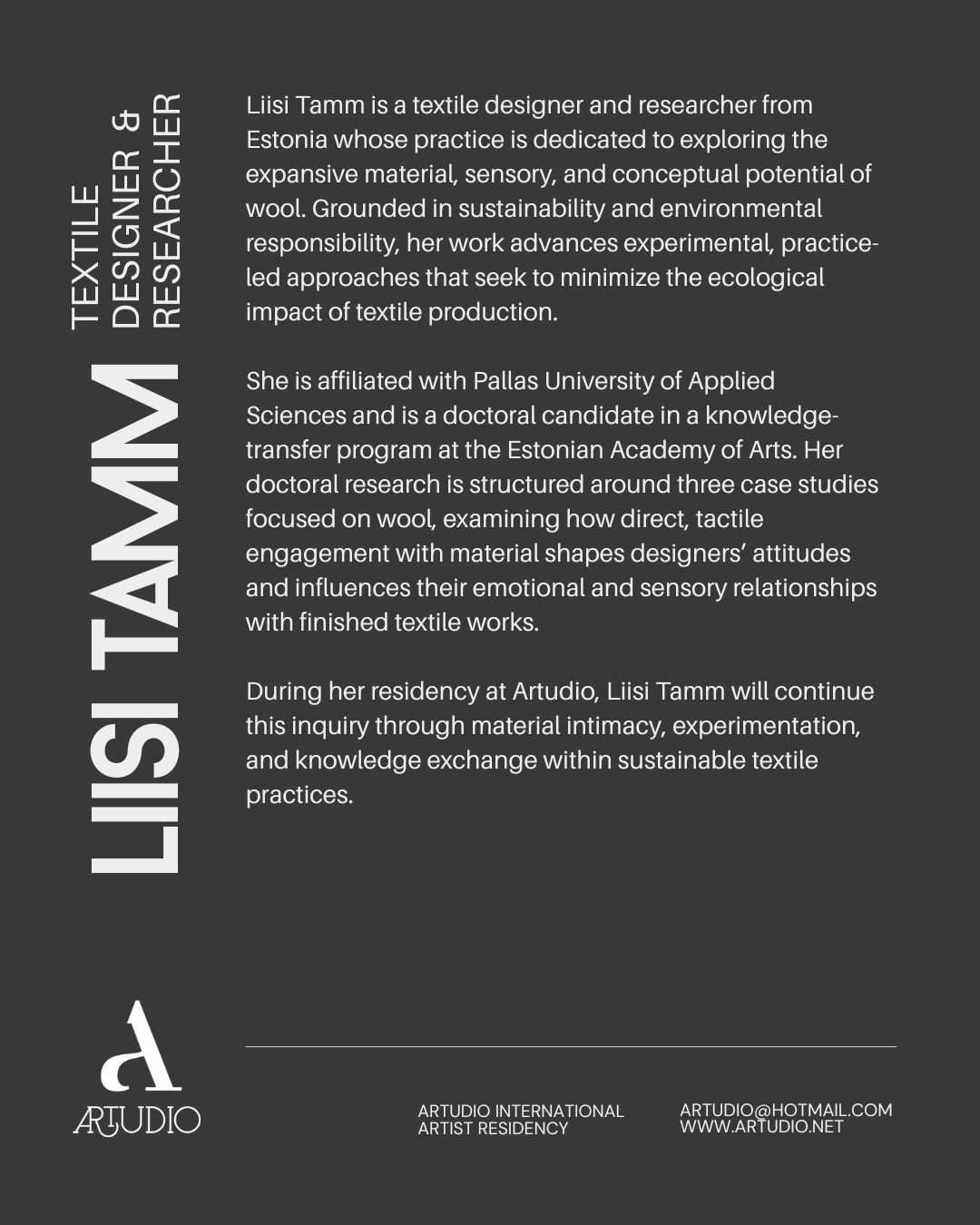 Artudio is pleased to welcome Liisi Tamm as its Resident Artist for February–March 2026. A textile designer and researcher from Estonia, Tamm’s practice is rooted in an in-depth exploration of wool as a material with expansive sensory, conceptual, and ecological possibilities. Her work is guided by a strong commitment to sustainability, advancing experimental and practice-led methodologies that critically address the environmental impact of textile production.